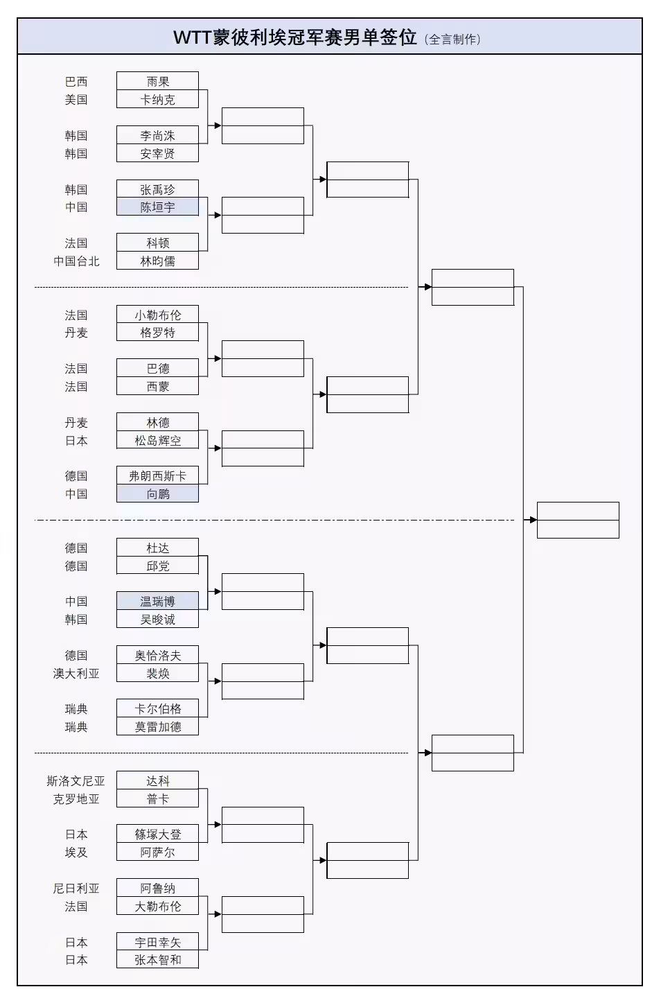 至於4/4區還有3位日本名將張本智和、宇田幸矢、篠冢大登,不過他們扎堆於此只能有1人晉級4強,而法國的大勒布倫、奈及利亞的阿魯納、斯洛維尼亞的達科都是贏過中國隊主力的高手,希望溫瑞博能衝出重圍,也期待國乒小將們能順利會師。