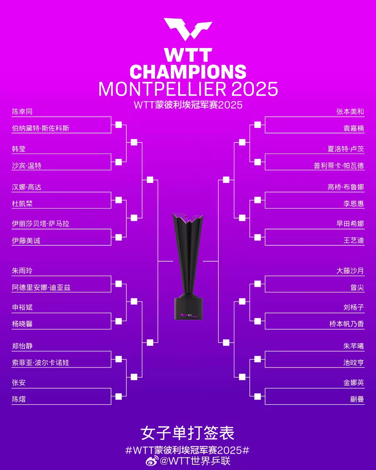 女單方面,國乒四位選手分別進入四個1/4區。賽會頭號種子陳幸同自動進入1/4區,首輪對陣羅馬尼亞的斯佐科斯,同在1/4區的還有日本的伊藤美誠,她首輪對手是羅馬尼亞的薩馬拉。陳熠進入2/4區,首輪與美國的張安交手,代表澳門出戰的朱雨玲同樣進入這個區,首輪對陣波多利亞的迪亞茲。