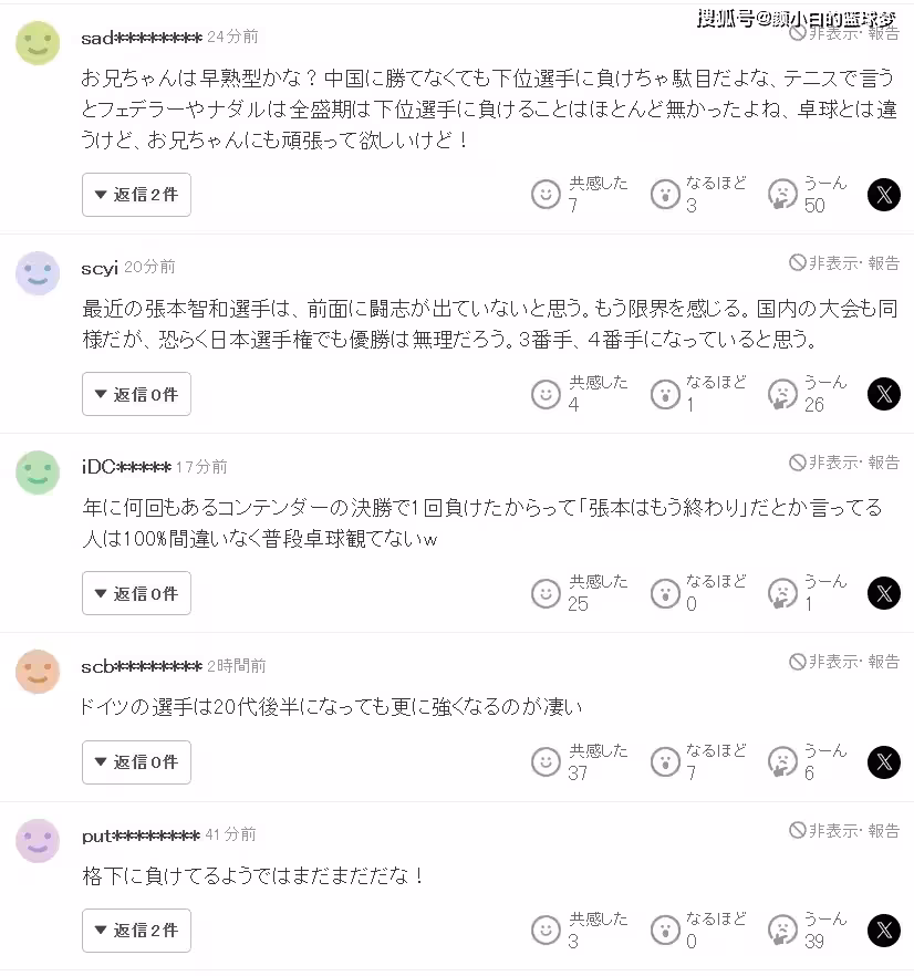 1.張本智和是出道即巔峰的類型嗎?就算贏不了中國選手也不該輸給排名更低的外線啊!用網球來說費德勒/納達爾巔峰時期幾乎不會輸給排名更低的選手,雖然桌球與網球不同,但希望張本智和能加油;