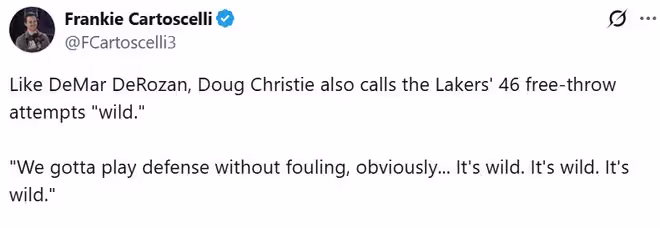 不光是德羅贊,國王的主教練克里斯蒂也急眼了,賽後採訪他的美國記者現場就表示:「克里斯蒂說湖人隊全隊得到46次罰球,太誇張了,這簡直是離譜,這是一個很瘋狂同時也很不可思議的數據。」