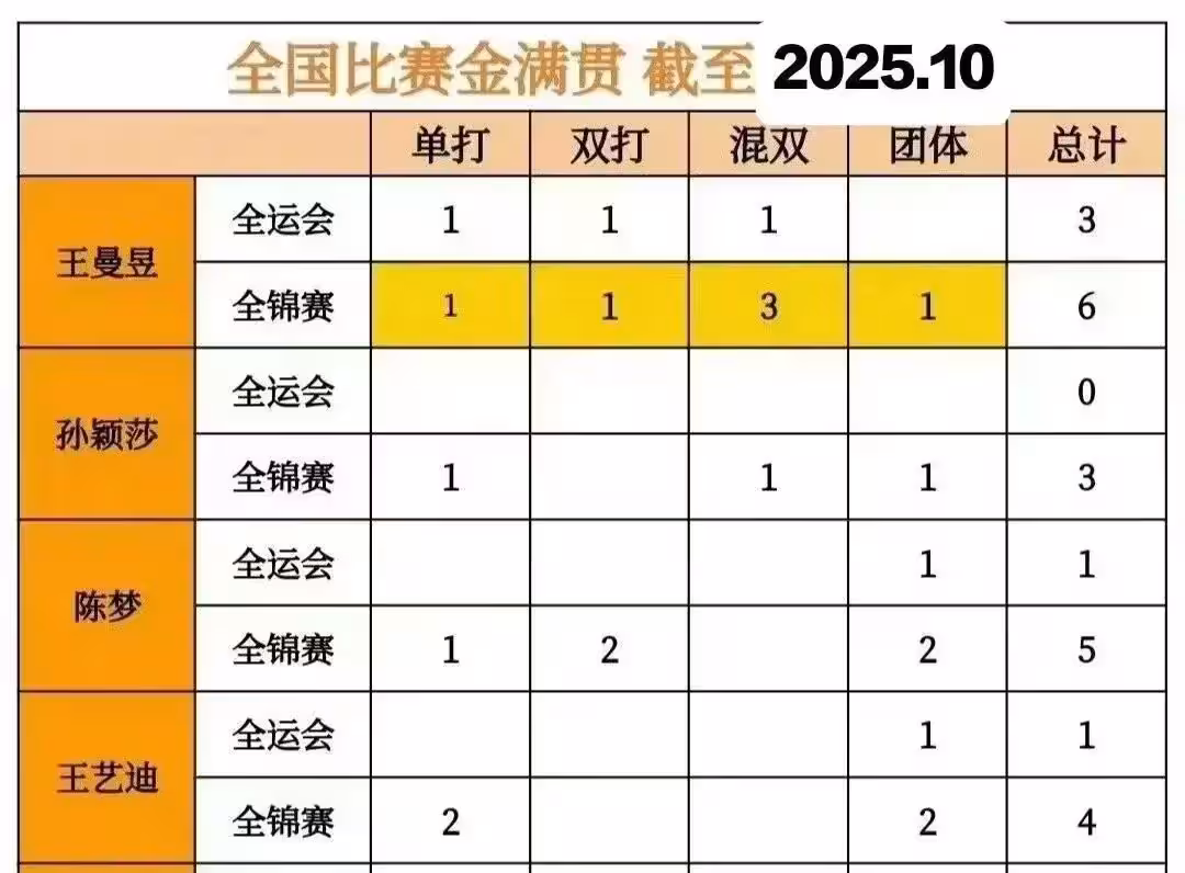 __國乒現役全運會金牌榜:樊振東5金封王,孫穎莎0冠全運沖金成焦點