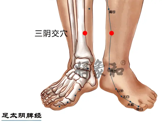 ③揉三陰交穴:盤腿端坐,用左手拇指按壓三陰交穴(內踝尖上3寸,脛骨後緣處),左旋按壓15次,右旋按壓15次,然後用右手按壓左三陰交穴,手法同前。