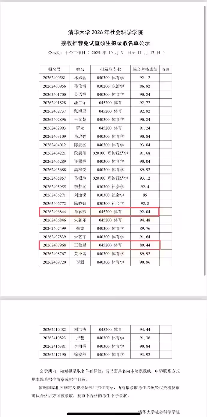 此前報道,9月16日,清華大學社會科學學院對接收優秀應屆本科畢業生免試攻讀研究生綜合考核名單進行公示,中國桌球隊運動員孫穎莎、王曼昱榜上有名。