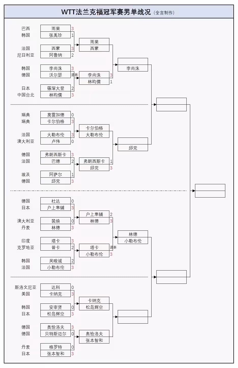 緊接著第二輪又有2位前八號種子出局,包括日本的大藤沙月、中國台北的林昀儒,而日本的2位世界冠軍篠冢大登、戶上隼輔已經全軍覆沒,先後在兩輪比賽中被淘汰,以下為晉級詳情: