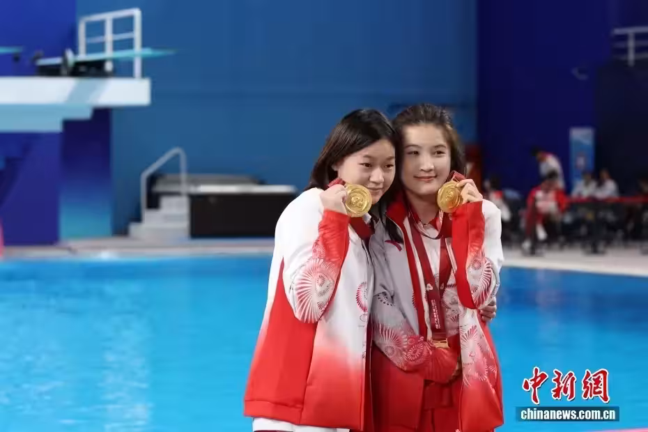11月11日,第十五屆全國運動會跳水項目在廣東省奧體中心游泳跳水館迎來最後一個比賽日。圖為女子3米跳板決賽結束後,全紅嬋(左)和王偉瑩持金牌在館內合影。中新社記者 陳楚紅 攝