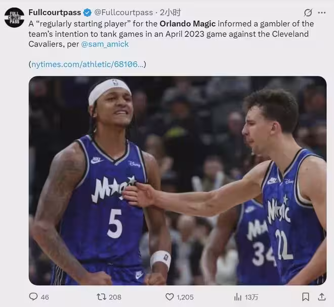 那場比賽是2023年4月7日,騎士118-94大勝魔術。教主搜了一下,那個賽季魔術常規首發球員,而且已經離開魔術的包括富爾茨和加里-哈里斯。讓人疑惑的是,羅齊爾、比盧普斯和達蒙-瓊斯均被逮捕,魔術這名球員居然沒被起訴。