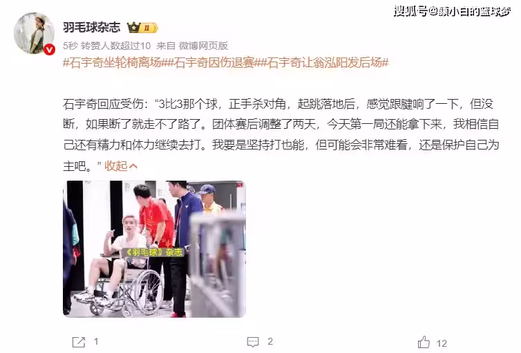石宇奇一瘸一拐退賽!坐輪椅離場無緣男單四強 採訪透露跟腱沒斷