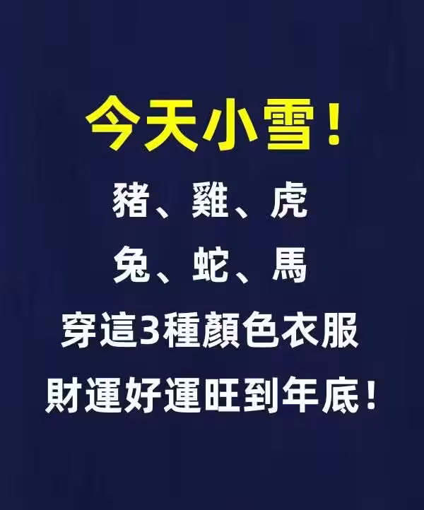 今年小雪(11/22前後)特別推薦 6大生肖:豬、雞、虎、兔、蛇、馬,只要在這段時間穿對顏色,財運、事業、人緣「一路旺到年底」!