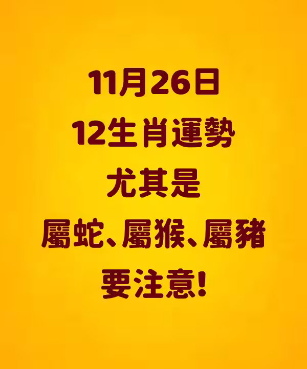 11月26日12生肖運勢 尤其是屬蛇、屬猴、屬豬要注意!