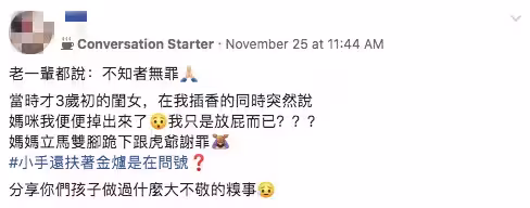 就在她想要開口詢問女兒時,空氣中突然飄來了一股臭味,再低頭一看,發現女兒一手扶著虎爺公的金爐,一手則遮著自己的屁股,滿臉無辜又無助地跟媽媽說,「我便便掉出來了…我只是放屁而已」。