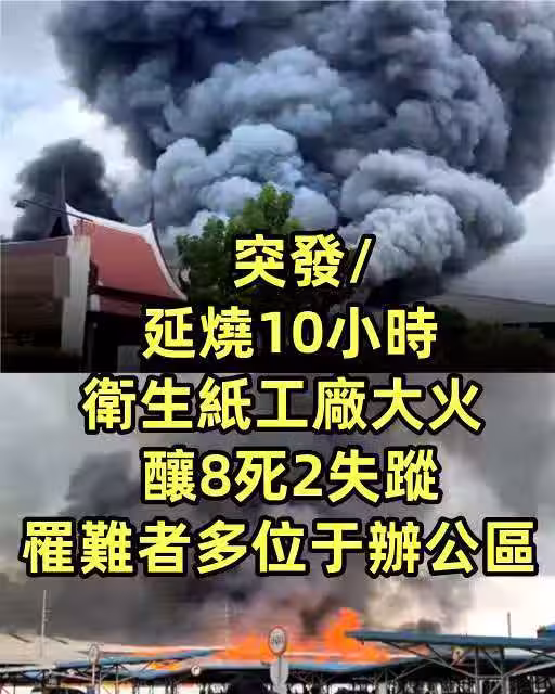 突發/延燒10小時 衛生紙工廠大火釀8死2失蹤 罹難者多位於辦公區 泰國北標府農凱縣(Nong Khae)一座衛生紙工廠最近突發火災,火勢迅速從一樓儲存易燃物的房間延燒至整棟大樓,造成多人受困。