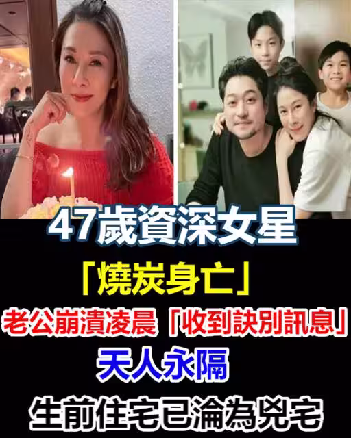 47歲資深女星「燒炭身亡」! 老公崩潰凌晨「收到訣別訊息」天人永隔,生前住宅已淪為凶宅