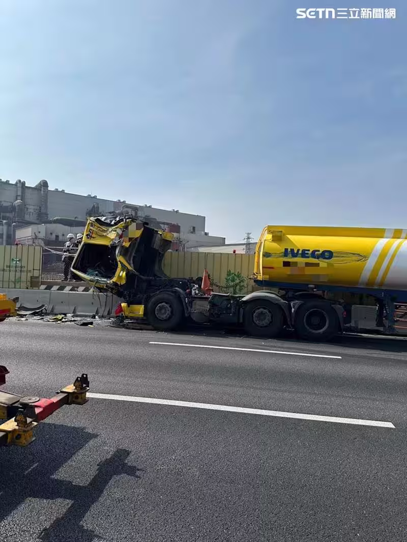 國道警方調查,徐男駕駛(46歲)的半聯結車行驚南下343.8K處,為了閃車與外側車道李男(53歲)駕駛的半聯結車發生碰撞,導致整輛車因為撞擊力道過大失控撞破護欄沖向北上車道,董男(39歲)為閃避翻車撞外側護欄側翻。