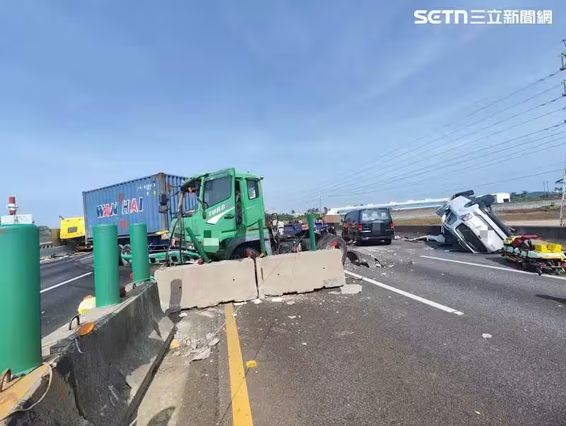 聯結車「折甘蔗」橫跨南北國道!破護欄橫空出世 自小客駕駛嚇到翻車