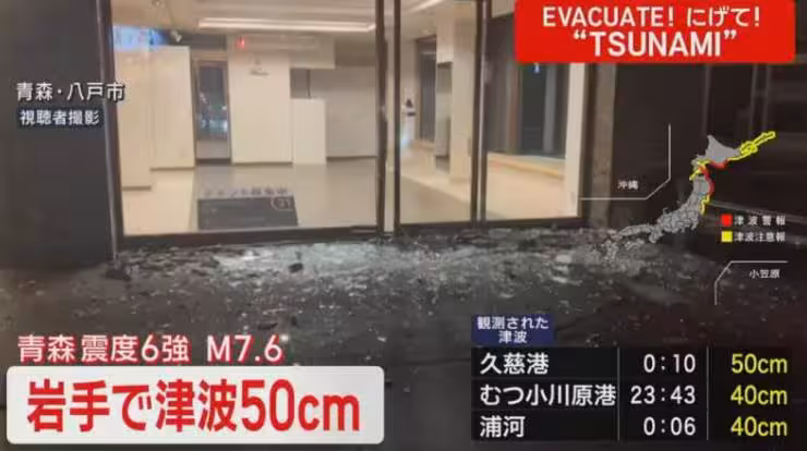 日本青森縣外海8日晚間發生規模7.6強震,有大樓落地窗碎裂,滿地都是玻璃碎片。