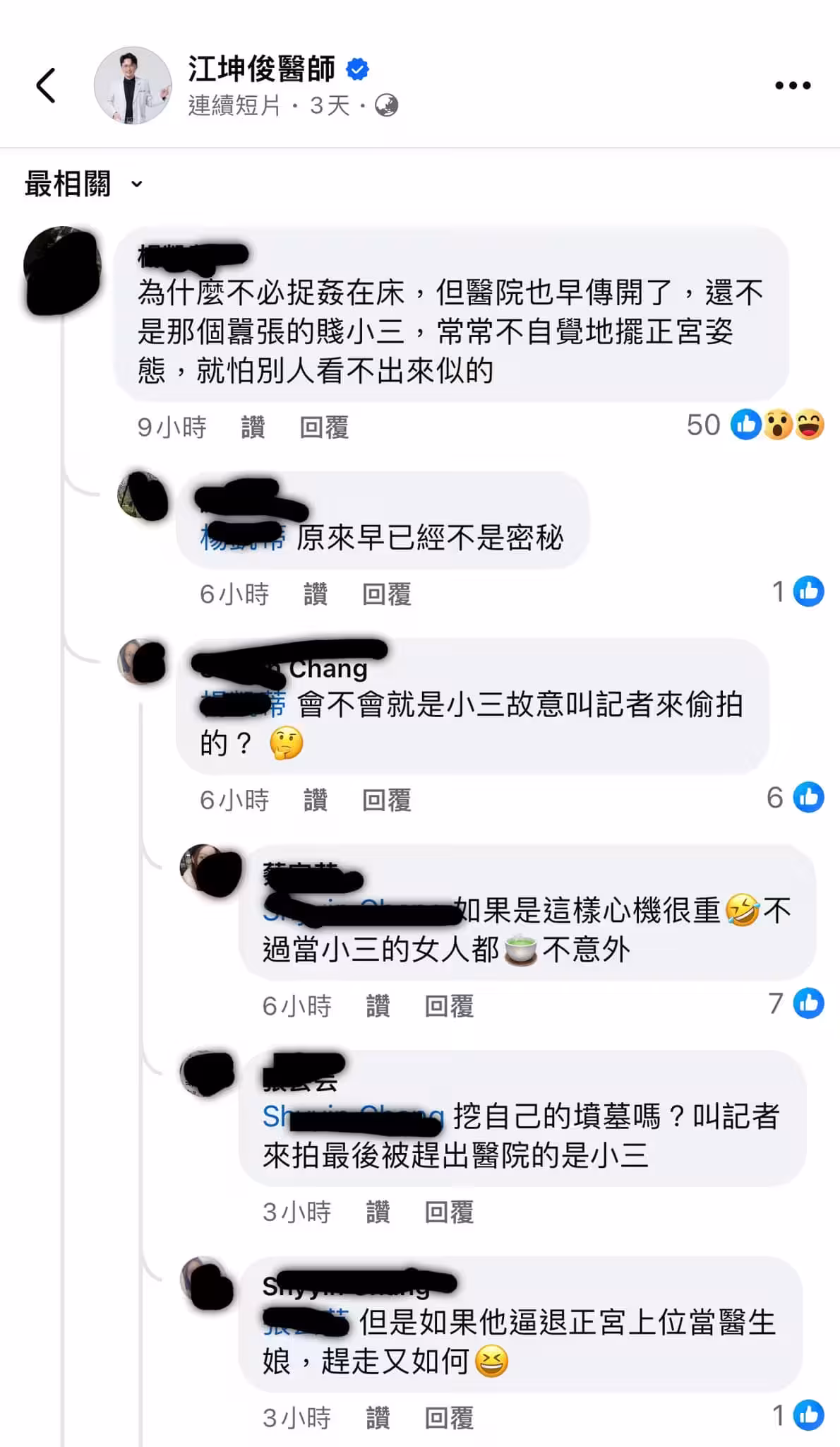 知名女律師李怡貞在粉專「女人大律師李怡貞」發文,透露睡前才看過江坤俊臉書現況,發現有一名網友竟留言爆料,「為什麼不必捉姦在床,但醫院也早傳開了,還不是那個囂張的賤小 三,常常不自覺地擺正宮姿態,就怕別人看不出來似的」,疑似外遇早有徵兆,多名網友也紛紛留言,「原來早已經不是秘密」、「會不會就是小 三故意叫記者來偷拍的?」。