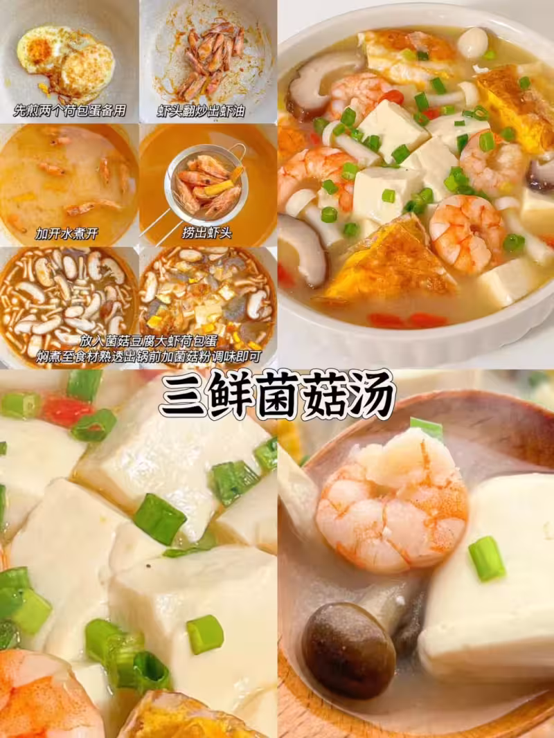 先炒蝦頭出紅油,加開水撈出蝦頭,放菌菇、豆腐、大蝦、荷包蛋同煮。