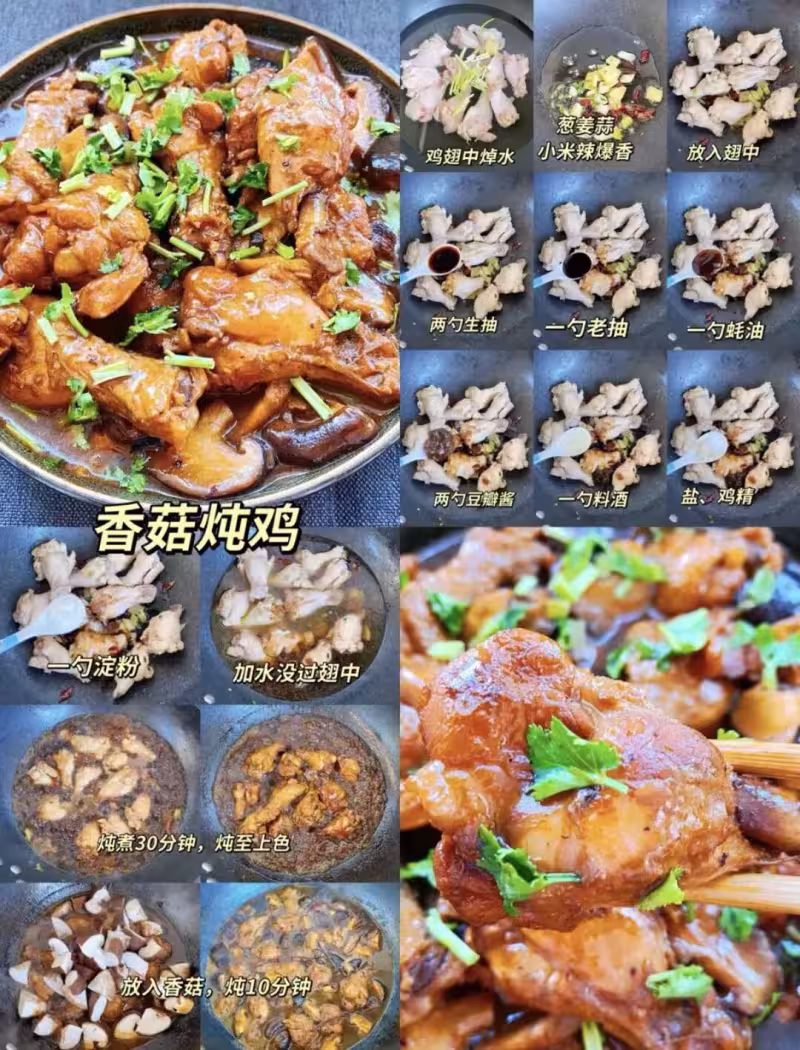 先把雞翅中焯水,用蔥姜蒜和小米辣爆香,再放入雞翅翻炒,淋上生抽、老抽、蚝油和豆瓣醬,加一碗水慢慢燉,讓雞翅吸滿醬香,燉到上色後放進香菇再煨十分鐘,最後撒一把香菜。雞翅軟嫩脫骨,香菇吸足了肉香,每一口都是濃郁的鮮香,像把時光都燉得慢悠悠的,暖乎乎的香氣里滿是家的味道~