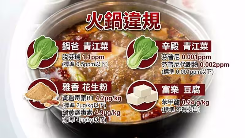 台北市衛生局最新公布的火鍋料抽驗結果令人擔憂,共抽驗 60 件火鍋相關食材中,有 6 件不符合規定,包含知名連鎖火鍋品牌「鍋爸」、「雅香」、「辛殿」等。問題食材包括檢出黃麴毒素超標的花生粉、含有苯甲酸的豆腐,以及農藥殘留超標的蔬菜。這些不合格食材可能對人體健康造成危害,業者們表示已經處理完畢並更換供應商,專家也提供了降低食安風險的方法。