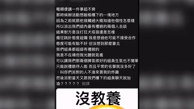 一群台中某大學行銷系學生在舉辦活動時,因與想跟一樓炸雞店老闆談抽成引發糾紛,學生在網絡上發文抱怨老闆態度不佳,引起爭議。事件延燒後,學生最終在社群平台公開道歉。這起始於商業合作卻演變為公關危機的事件,成為這些行銷系學生畢業前最深刻的一堂實戰課程。