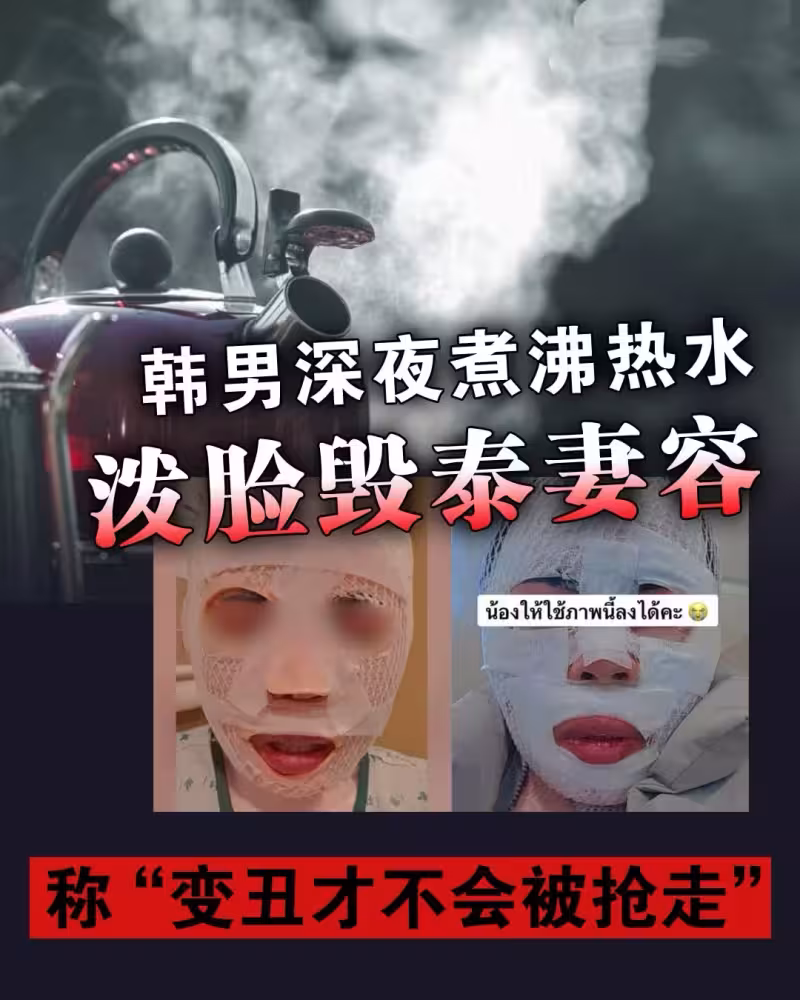 韓男深夜煮沸熱水 潑臉毀泰妻容 稱「變醜才不會被搶走」