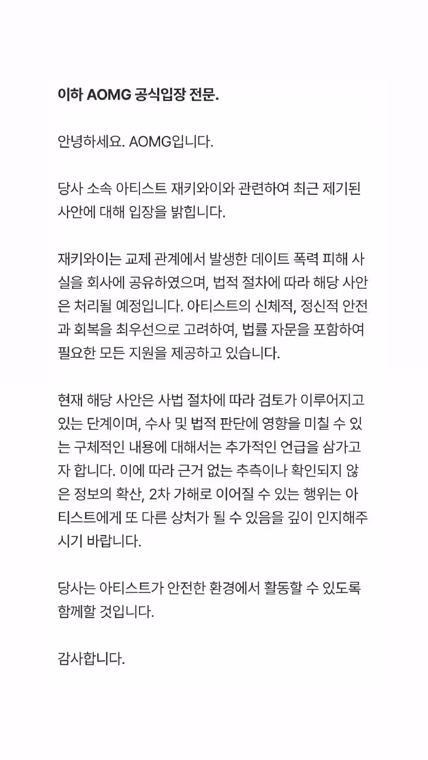 Jvcki Wai 所屬公司 AOMG 於今(15日)晚間發出聲明表示,Jvcki Wai 已將交往期間遭受的約會暴力情況通報公司,事件目前 正在法律程序中處理。