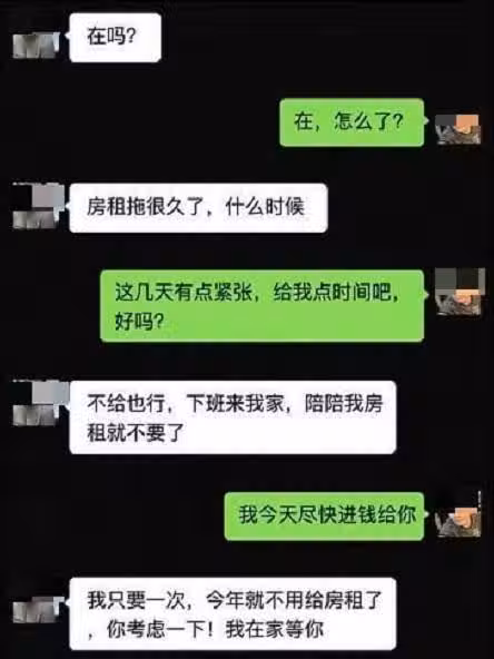 根據TVBS新聞網報導,近日中國微博上瘋傳一張微信的對話截圖,畫面中可以看到一位女房東傳訊質問,「在嗎?房租拖很久了,什麼時候」,而男房客則回應,「這幾天有點緊張,給我點時間吧,好嗎?」,懇請女房東體諒他近日手頭比較緊,寬裕幾天再給繳錢。