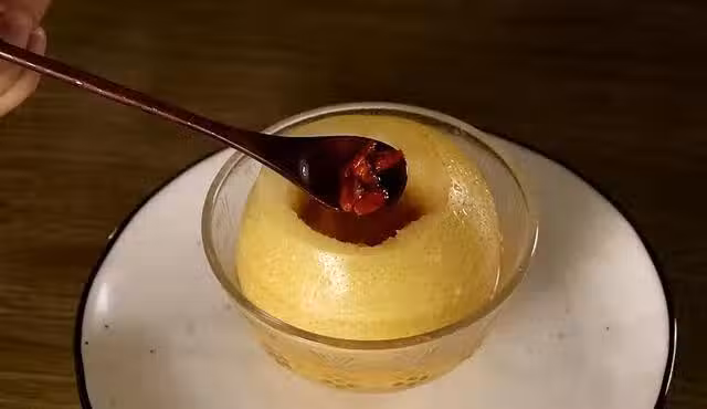 1:雪梨把外皮用鹽搓洗乾淨,切去頂端,把雪梨扣出一個洞,注意不要扣破,您也可以把梨子皮洗洗乾淨,然後連皮一起煮;