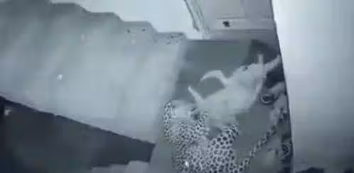 花豹深夜闖入單元樓,悄無聲息靠近看門狗,狗子睡夢中就被叼走!