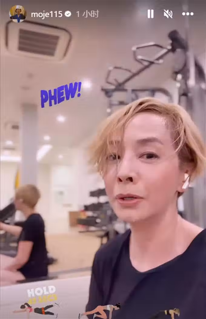 畫面中,毛舜筠出現在健身房,只見她穿著黑色短袖衫和短褲,頭髮染成淺金色,打扮活力十足。剛做完劇烈運動的她,大汗淋漓滿面紅光。她的頭髮已經被汗水浸濕,她直接頂著凌亂的頭髮出鏡,毫無明星包袱。