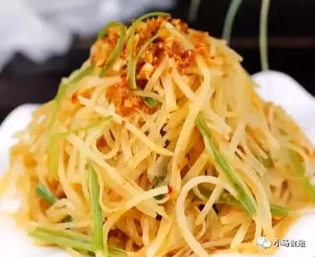 3. 將土豆絲、香菜段、胡蘿蔔絲倒入盛器內,鹽、味精、香油、辣椒油、花椒油,拌勻裝盤即成。