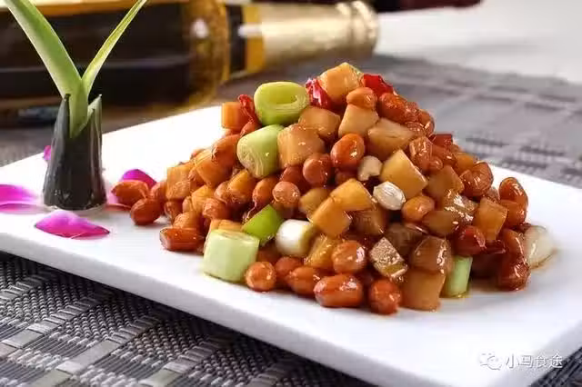 3.起鍋燒油,下入干辣椒、花椒、蔥丁、青紅椒丁炒香,倒入碗汁,下入土豆丁、熟花生米、紅油少許,快速翻炒均勻即可出鍋。喜歡吃肉的朋友可以在炒的時候加入適量的雞肉或者豬肉等食材。