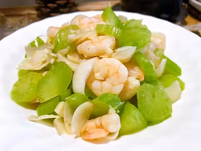 食材:百合、西芹、蝦仁、蒜末、料酒、鹽、胡椒粉、食用油。