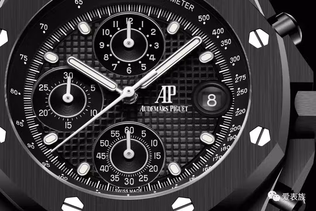 這款新款皇家橡樹離岸型黑色陶瓷 26238CE 的另一個顯著區別是錶盤。首先,就像 2021 鋼款一樣,它以經典方式採用小巧的格紋圖案帶回了Beast的經典外觀。該型號的新功能是全黑外觀、子錶盤和日期盤。錶盤的所有元素——指針、標記、軌道、字體——以及布局,如果與 1993 年的型號相比略有更新,感覺還是很熟悉的。由於自產新機芯緣故,小計時盤的位置和大小發生了變化---現在秒針盤在 6 點,而小時盤在 12 點,與其他當前的 42 毫米離岸型腕錶一樣。。儘管如此,它仍保留了 ROO 的整體標誌性風格。
