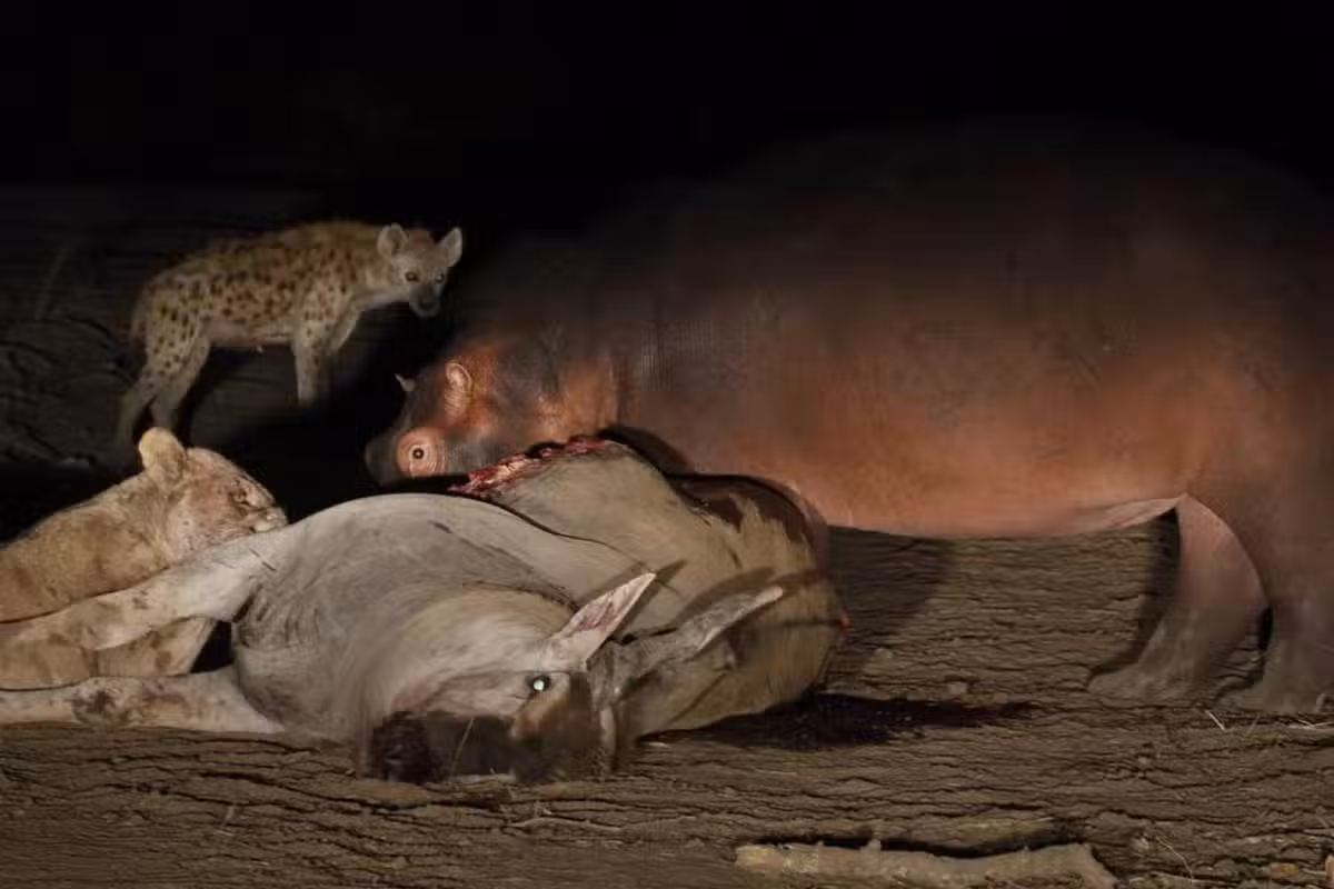 馬納波爾斯國家公園是位於辛巴威與尚比亞交界處的一個野生動物保護區,這里動物種類豐富多樣,河馬和鱷魚的數量尤其眾多,每當旱季,又會吸引大量的斑馬、大象以及野牛前來,此外,更有多達500隻瀕危的黑犀牛棲息於此。在這樣一個自然條件得天獨厚的保護區,你更容易觀賞到那些罕見的野生動物互動,攝影師約翰和他的同伴們就幸運地觀測到獅子、斑鬣狗、鱷魚以及河馬之間的食物爭奪戰。他是這樣描述那一天所發生的事的:
