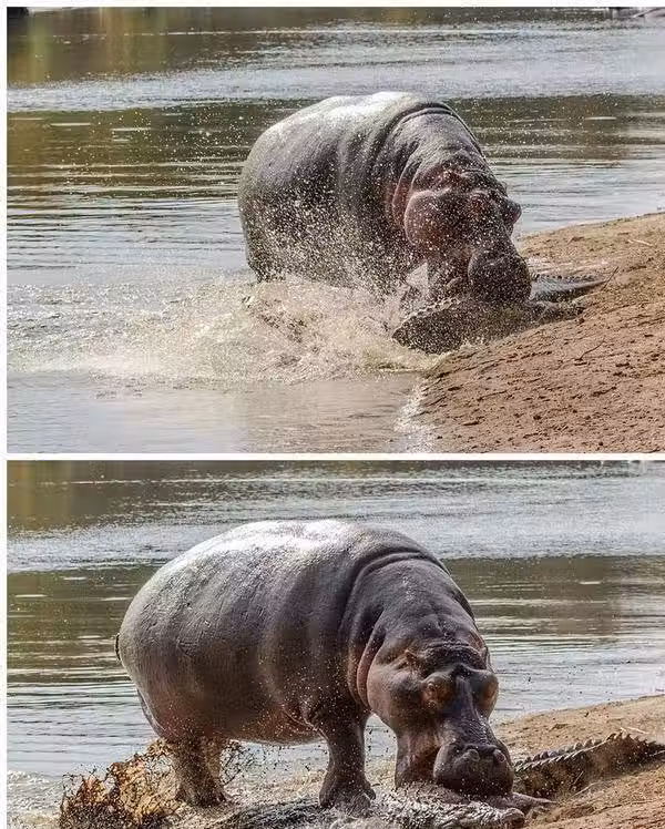 帥不過三秒!鱷魚偷襲小河馬霸氣狂甩,暴怒母河馬下秒趕到「泰山壓頂」,一分鐘送鱷魚上西天