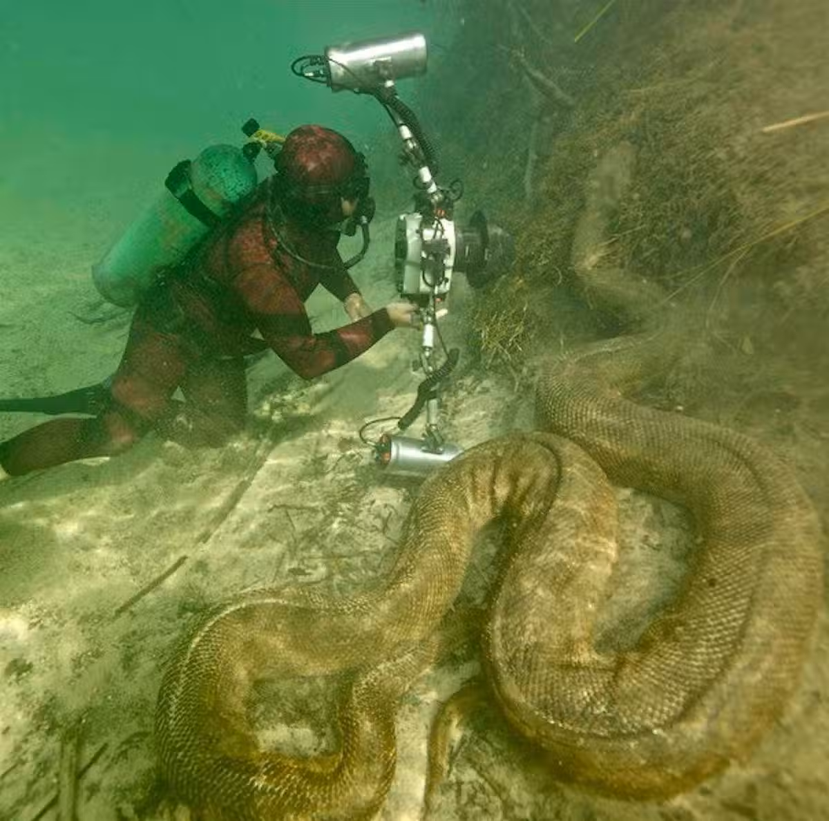 小夥潛水偶遇8米森蚺,身材粗長眼睛放光,冒死零距離拍照 光看著就令人毛骨悚然