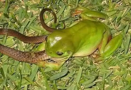 樹蛙正在一手抓住蛇的七寸之後,就把它往嘴裏送, 但蛇雖然佔了下風,依舊頑強地張嘴咬住青蛙的下顎。然而,蛇終於堅持不住了,整個頭都被樹蛙吞進去了