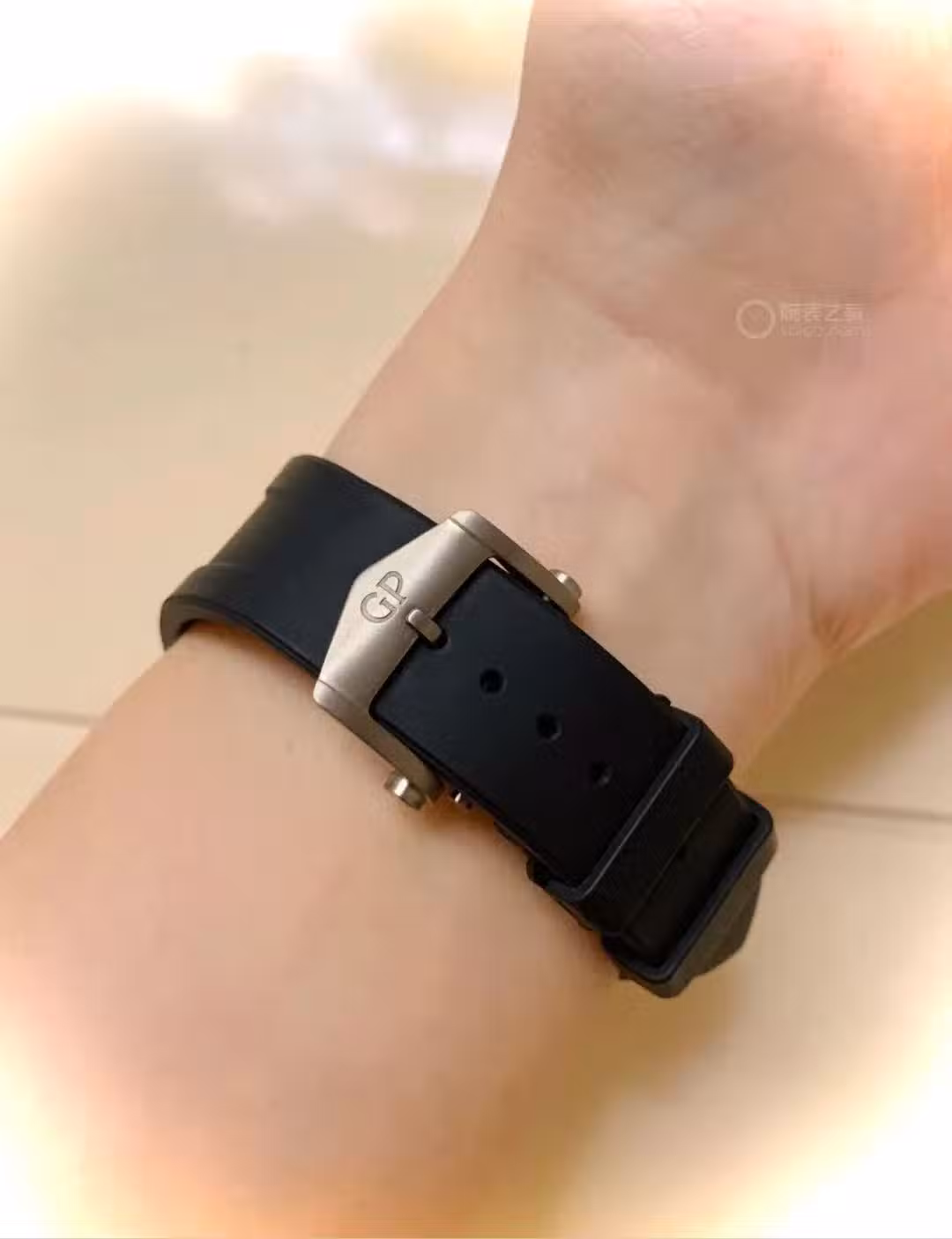 ▲露在外面的表扣是鈦金屬的,與表殼材質呼應顏色一致,橡膠錶帶佩戴非常舒適(原裝鱷魚皮錶帶一次未用收起來了)