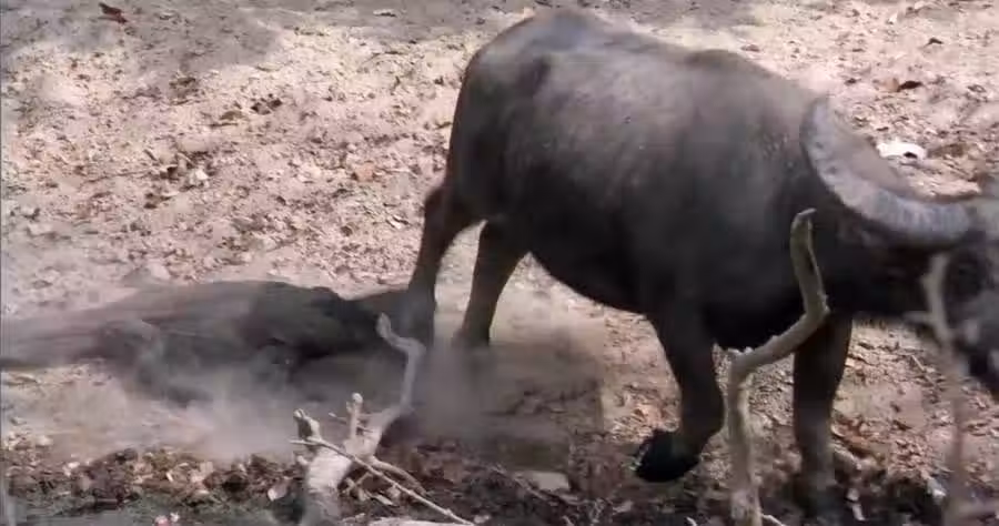 科莫多龍試圖對野牛展開進攻,同時十分小心地躲避野牛鋒利的牛角和笨重的牛蹄。野牛懶洋洋地進行迴避,但腳上還是被科莫多龍咬了一口。這一下,野牛隻是破了個小口子,不足掛齒。然後,野牛厭倦了這個討厭的「小蜥蜴」,不耐煩地離開了。科莫多龍則跟著野牛,不再發動進攻。