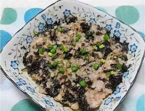 7、用剪刀剪成小小塊紫菜, 把紫菜加入肉沫中拌均勻。