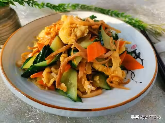【黃花菜炒雞蛋】所需材料:黃花菜(干)150克、黃瓜半根、胡蘿蔔半根、雞蛋3個、油鹽適量、蔥1段、姜2片、大蒜2瓣、