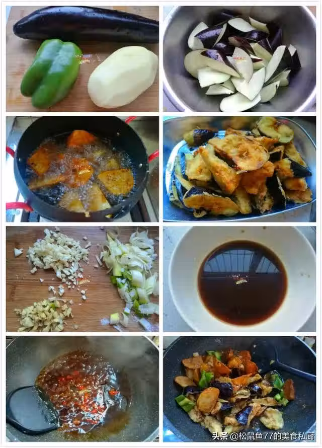 製作:茄子、青椒清洗乾淨,土豆去皮洗凈,茄子不用去皮(如果是圓茄子是需要去皮的),切成坡道塊,加入1勺鹽,顛翻均勻,腌制20分鐘,中間要顛翻幾次。調一個麵糊,碗內加入2勺麵粉、1勺玉米澱粉、1勺食用油,調和成濃稠合適的麵糊,用筷子挑起麵糊,能夠順利滴落為好。小鍋里倒入適量食用油燒至六成熱,茄子擠出汁水,裹上調好的麵糊,下入油鍋炸透、炸熟。炸成焦黃色,撈出來,炸好的茄子外殼是脆的,土豆也切成塊,下鍋一起炸熟。全部炸好後,等待油溫升高後,再復炸一次,茄子和土豆更好吃。準備一些蔥花、薑末、還有大蒜切成蒜末。再調一個碗汁:小碗內放入生抽2勺、米醋3勺、白糖2勺、玉米澱粉1勺,加入適量水混合攪拌均勻。炒鍋燒熱放油,先把調好的碗汁倒進去,小火慢慢翻炒均勻,慢慢煸炒至湯汁濃稠,出現大泡泡。下入蔥花、薑末、蒜末煸炒,再把炸好的茄子、土豆塊放進去翻炒均勻裝盤上桌。
