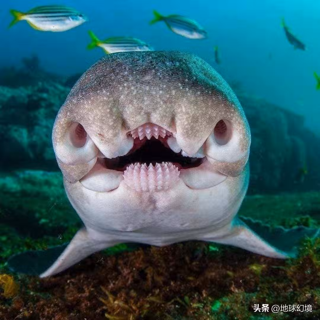 日本人的刺身,不僅追求食材的新鮮,還追求視覺上的沖擊力,往往魚沒有死透就上桌了,被做成了刺身,魚的嘴巴還在嗡動,有些殘忍。這種澳洲傑克遜鯊魚的牙齒很特別,兩只大鼻孔中間是如同齒輪一般的牙齒,它們用這種牙齒去咬碎貝殼,它們以貝殼為食物。