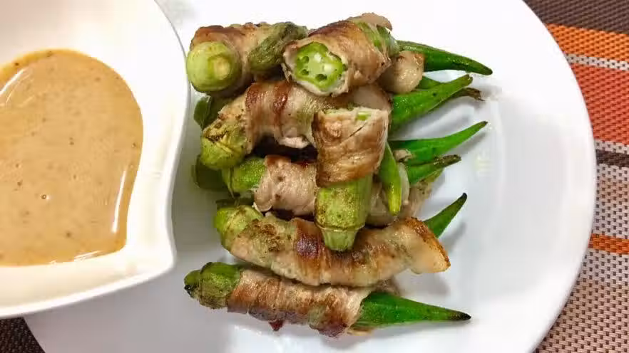 3 取一豬肉薄片攤平後放上步驟4的秋葵,然後慢慢的捲起
