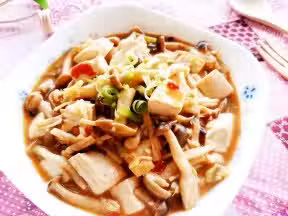 2 好菇道鴻喜菇切除底部剝成一朵朵,嫩豆腐切小丁,金針菇切小段