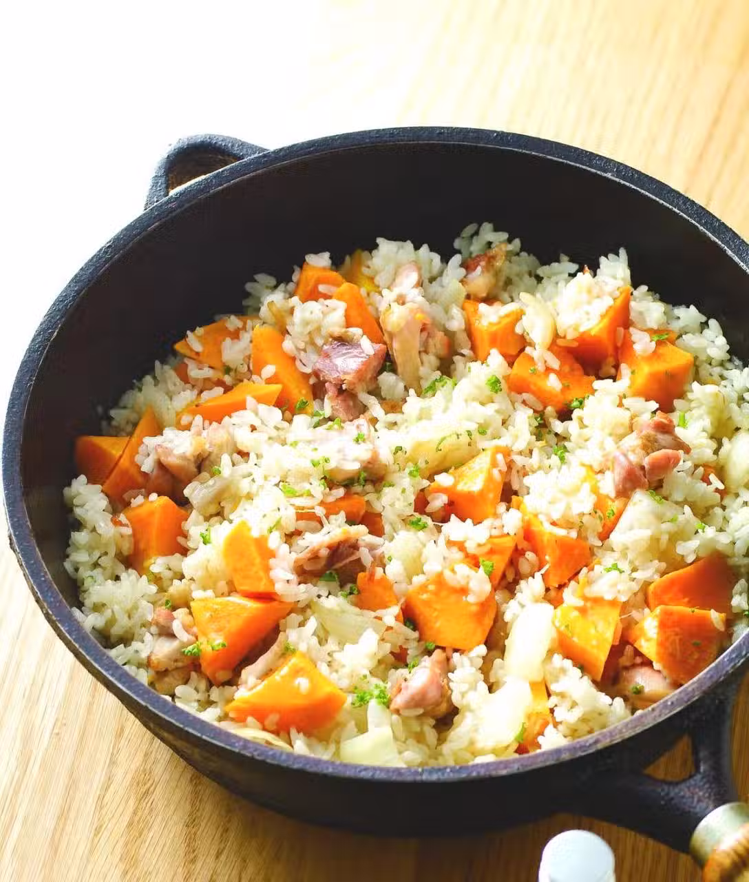 4 再分數次將剩餘的雞高湯加入,並以小火燉煮至白米全熟、地瓜塊軟化