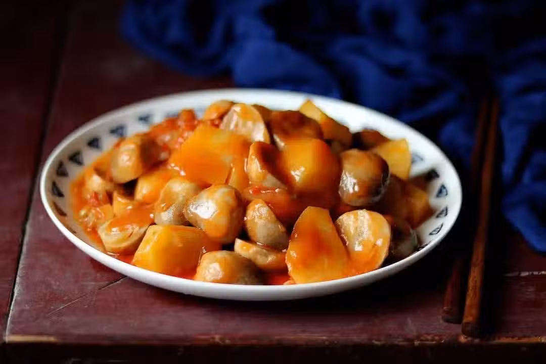 1. 草菇對半切開,土豆切滾刀塊,西紅柿去皮去皮切小塊