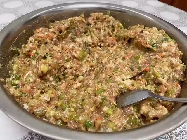 4:將芹菜末和豬肉餡混合攪拌均勻;
