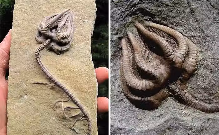 這個物種實際上並沒有滅絕,因為在我們的海洋中仍然發現了許多種類的海百合,上面顯示的是石炭紀的海百合化石。有趣的事實:票房熱門《異形》中的生物靈感來源於此。